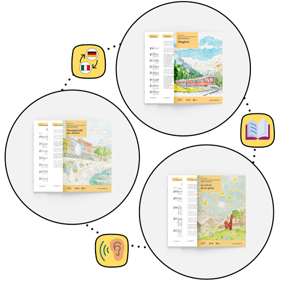 Die Perlen richten sich an die LehrerInnen und sind in deutscher Sprache verfasst, während die Arbeitsblätter mit den Sprachaktivitäten für die Kinder oder Lernenden (oder Schülerinnen und Schüler) bestimmt sind und auf italienisch verfasst wurden.